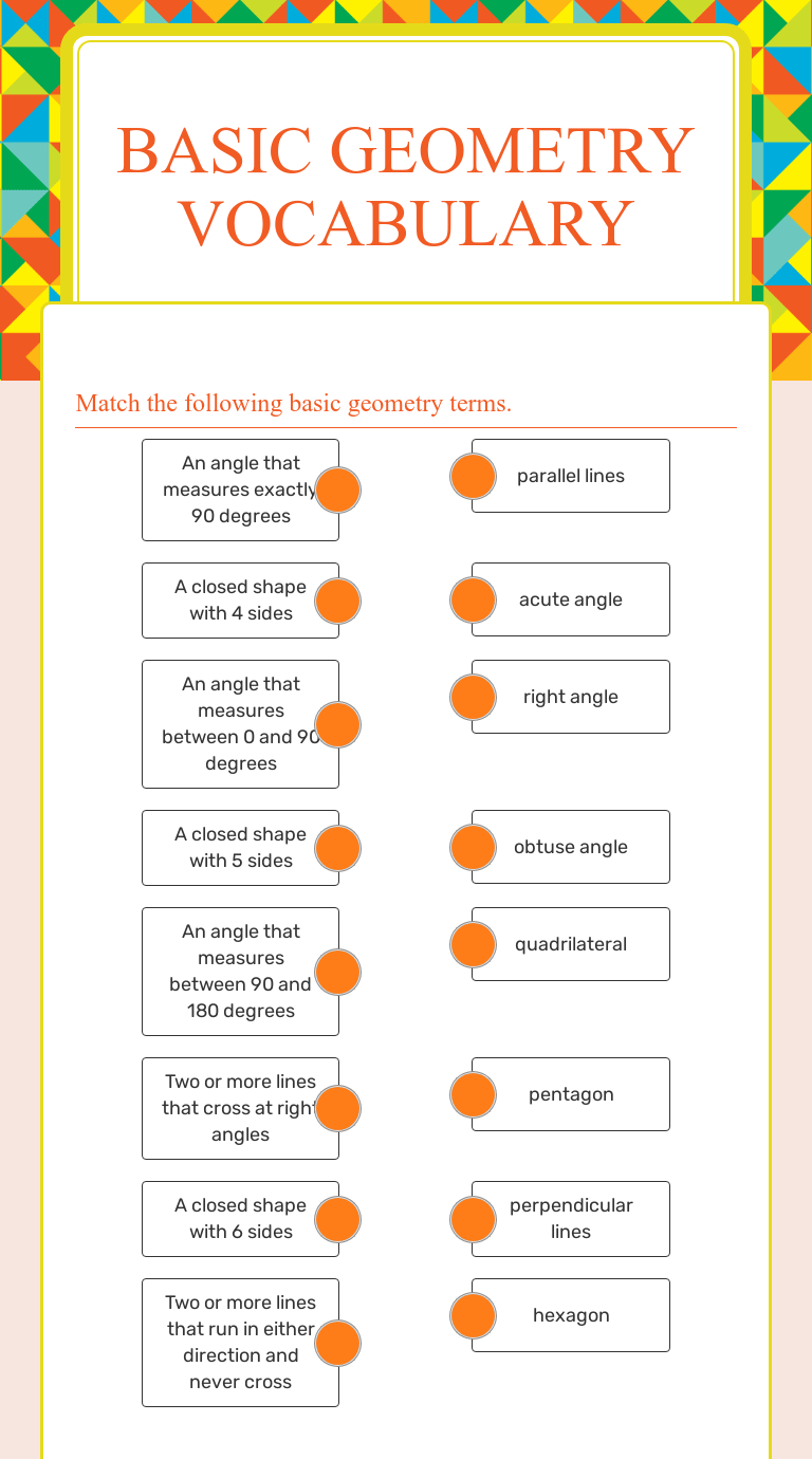 Worksheets available now and in the future. The plural form of the word is "vertexes" or. Addition · subtraction · multiplication · division · geometry . A short summry of the different terms used in geometry. What might show that geometry terms with an error. Match the vocabulary words on the left with the correct definitions on the right. A point has no dimension. The point at which the rays of an angle or the sides of a polygon meet; Geometry basics by teacher tiffany wood. This worksheet is in line with common core standards for 4th . Worksheets · flashcards · games · homework helper; Part of a line with two endpoints. Learn many terms earn more with flashcards games and food study tools displaying .